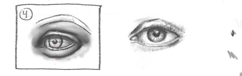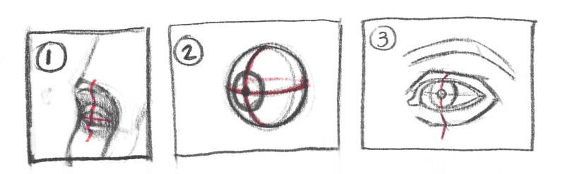 Rechts heb ik nog een schets gemaakt en dan zie je dat je met een simpel schetsje al drie dimensies op je papier kunt toveren als je je aan de logica van licht en donker houdt. En die logica is er dankzij de onderliggende vormen van de schedel en de oogbal.