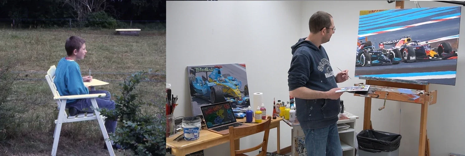 Toen mijn zoontje zat te tekenen, kreeg ik ineens ook weer zin. En dat gevoel hield aan. Ik begon met Formule 1 schilderijen en vond het heerlijk. Pas toen ontdekte ik wat ik eigenlijk echt leuk vond: werken naar de waarneming, technieken verbeteren, kleuren mengen, toonwaarden bestuderen. Ik dook er helemaal in.