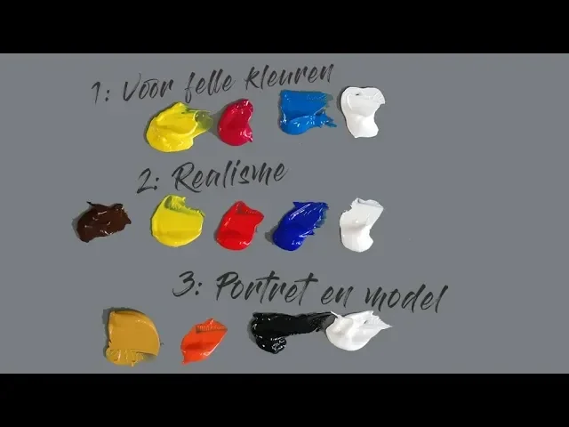 Als je weinig kleuren op je palet legt, raak je minder snel de kluts kwijt en leer je snel (beter) kleuren mengen. Je kunt makkelijker onthouden hoe je tot een bepaalde kleur bent gekomen en al snel zijn er geen geheimen meer. In deze video laat ik zien hoe je met weinig kleuren bijna alle kleuren kunt maken.