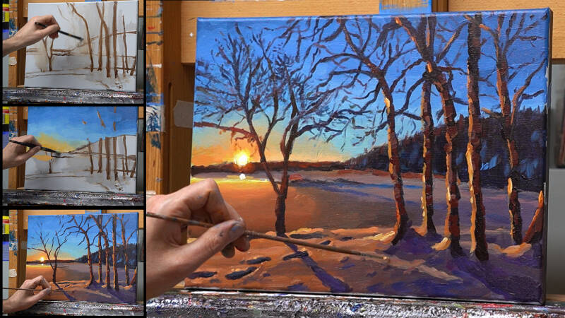 In deze video schilder ik een ondergaande zon met een winterlandschap. Ik gebruik een referentiefoto, maar ik wil vooral de sfeer zien te pakken en het liefst met een wat losse toets.