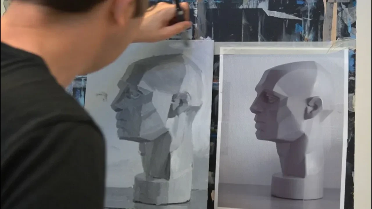 Het Asarohoofd is een mooi hulpmiddel om een portret te vereenvoudigen tot grote vlakken. Ieder vlak heeft een andere relatie met de lichtbron. Als het licht heel direct op een vlak valt, wordt dat vlak erg licht. Hoe meer een vlak van de lichtbron weggedraaid is, hoe donkerder het wordt.