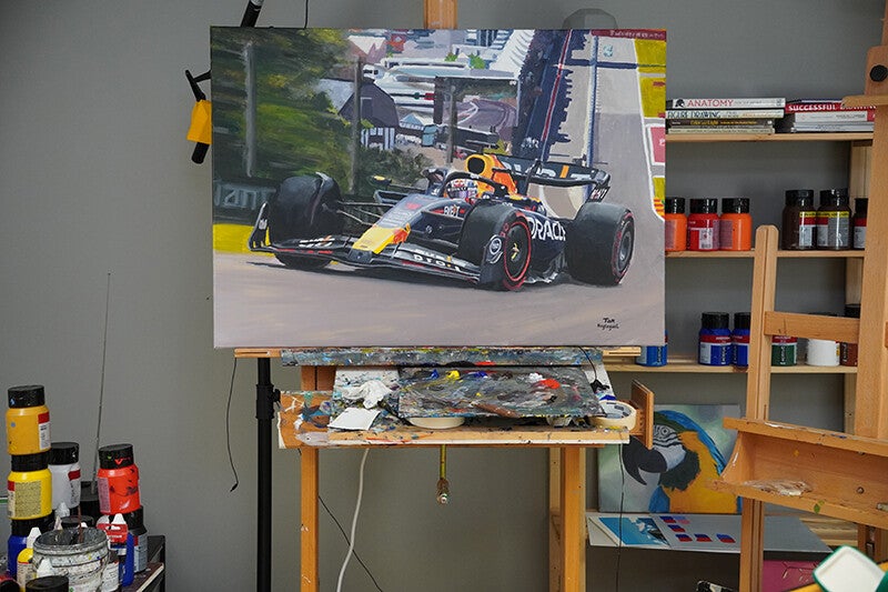Max Verstappen schilderij door Toon Nagtegaal. Handgeschilderd met acrylverf. De afmetingen van het doek zijn 100 x 70 cm. Het wordt geleverd met een ondertekend certificaat van echtheid. Het schilderij is voorzien van een matte vernislaag, zodat het vrijwel niet spiegelt.